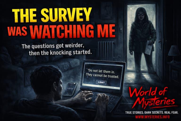 Now it’s been about thirty minutes and I haven’t moved from where I’m standing, I can still see her shadow under the door, still hear something shifting faintly behind the bedroom door after I locked it, something that definitely wasn’t there before, something that wasn’t part of my apartment this morning, and I don’t know which one of them is lying, the survey or the woman outside, but I know one thing for sure, whatever this is, it started the moment I clicked that ad, and I don’t think it’s going to end unless I make the wrong choice.